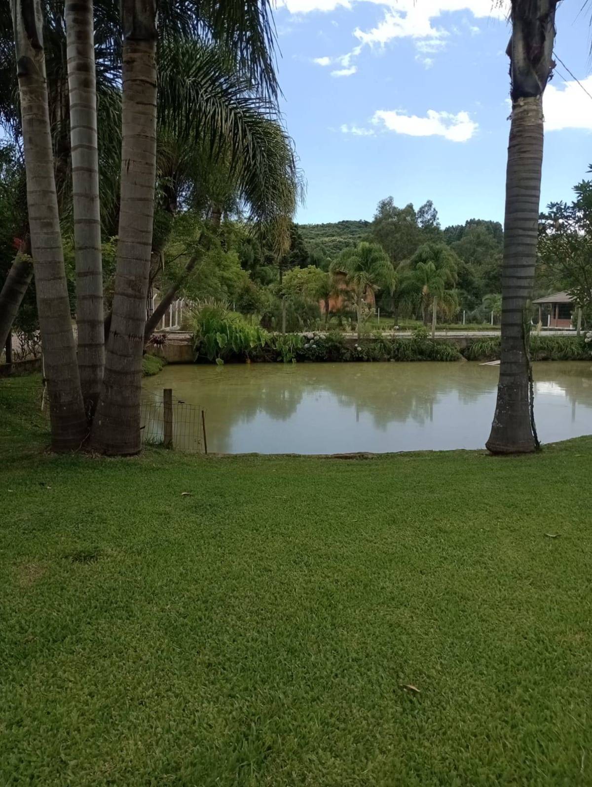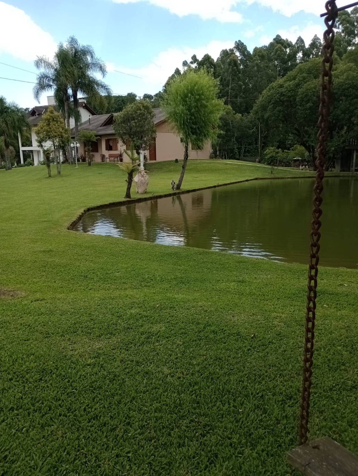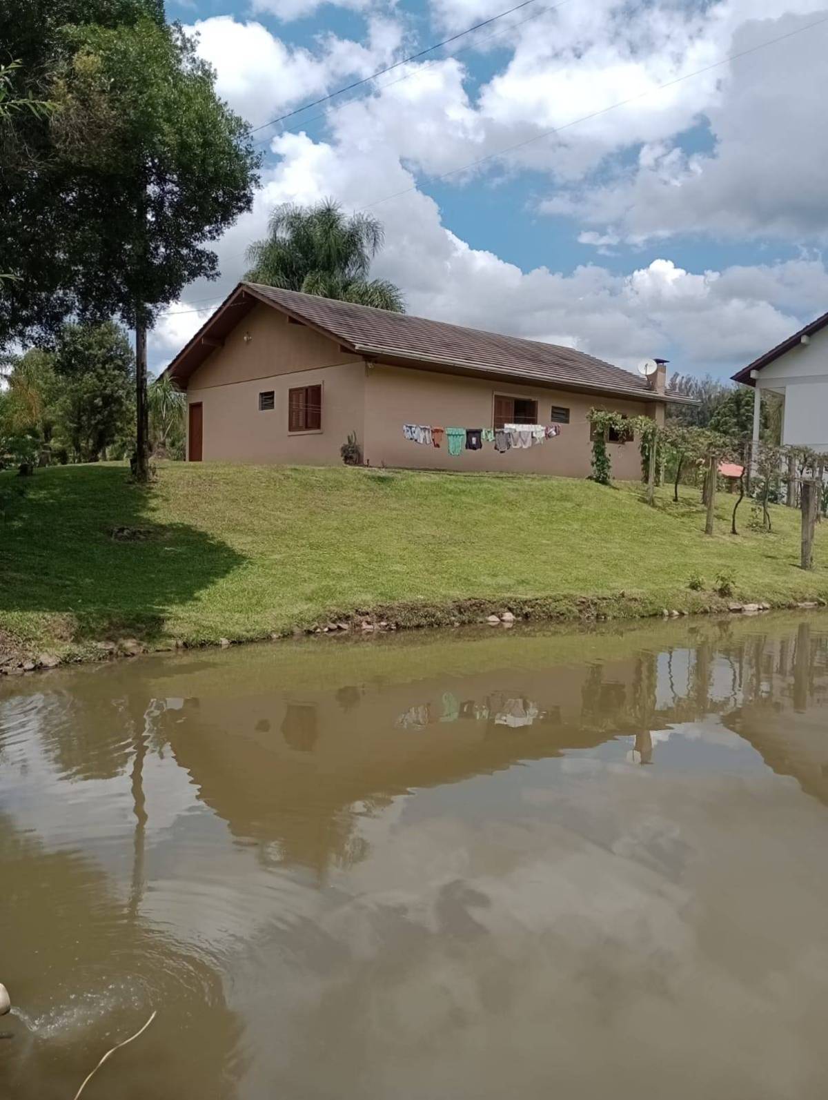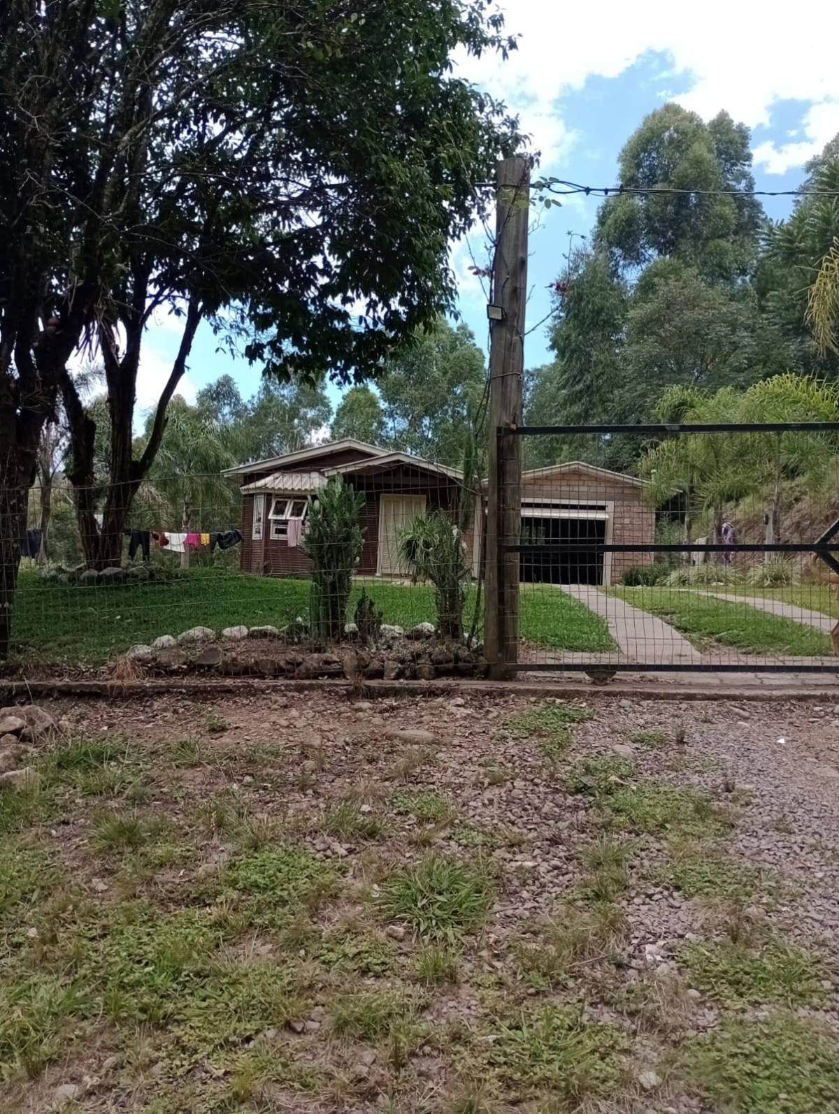 Casa material são 3 quartos ,2 banheiros, sala e cozinha individual, lavanderia tem juntos fogão campeiro e uma cozinha grande casa com 130 metros. Outra casa de madeira quarto, banheiro, sala e cozinha juntos e garagem, três açudes com peixes, carpas, jundiais, lambari, cascudos e tilapias, e outra já cavada p encher e por peixes, horta e fruteira ,terreno com 11.400 metros 52x220. Capela Santo Inácio Farroupilha 100 metros asfalto RS 122 .